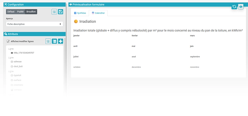 Idéal pour partager les informations que vous voulez avec vos utilisateurs, ce type de formulaire peut être enrichi d’actions diverses : affichage de la sélection sur Google Street View, lancement d’un traitement FME, lien vers une page de votre site…